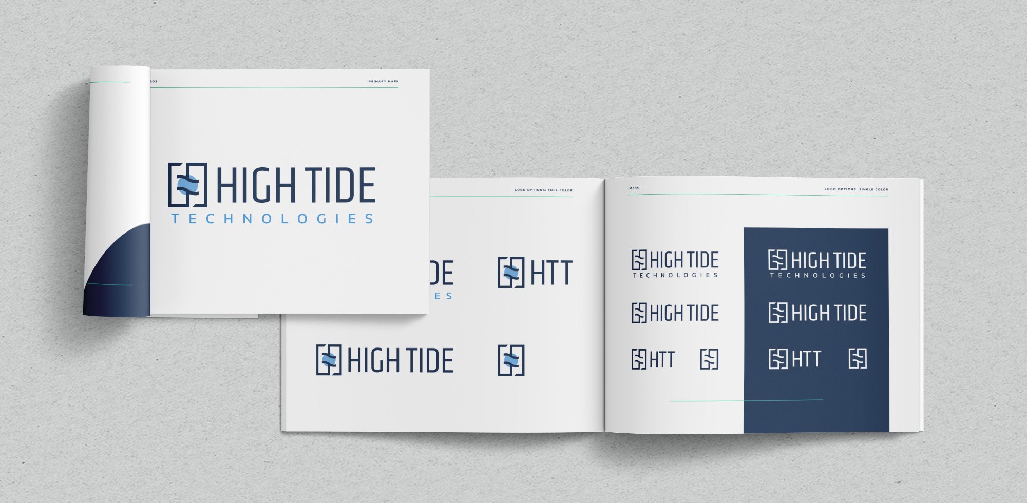 The icon incorporates their abbreviated name, HTT, while abstractly representing the monitoring of liquid/gas through a pipeline creating the “H” in High Tide. Alongside the icon is a simple typeset that allows for flexibility with the word “technologies,” which can remain in the logo mark or be removed without compromising consistency.